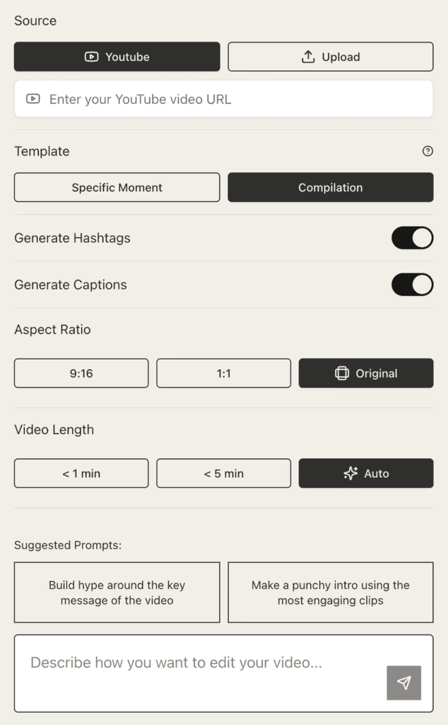 User in control. If you know which parts of the video you want to extract, you can also instruct our AI to choose those parts. For example: