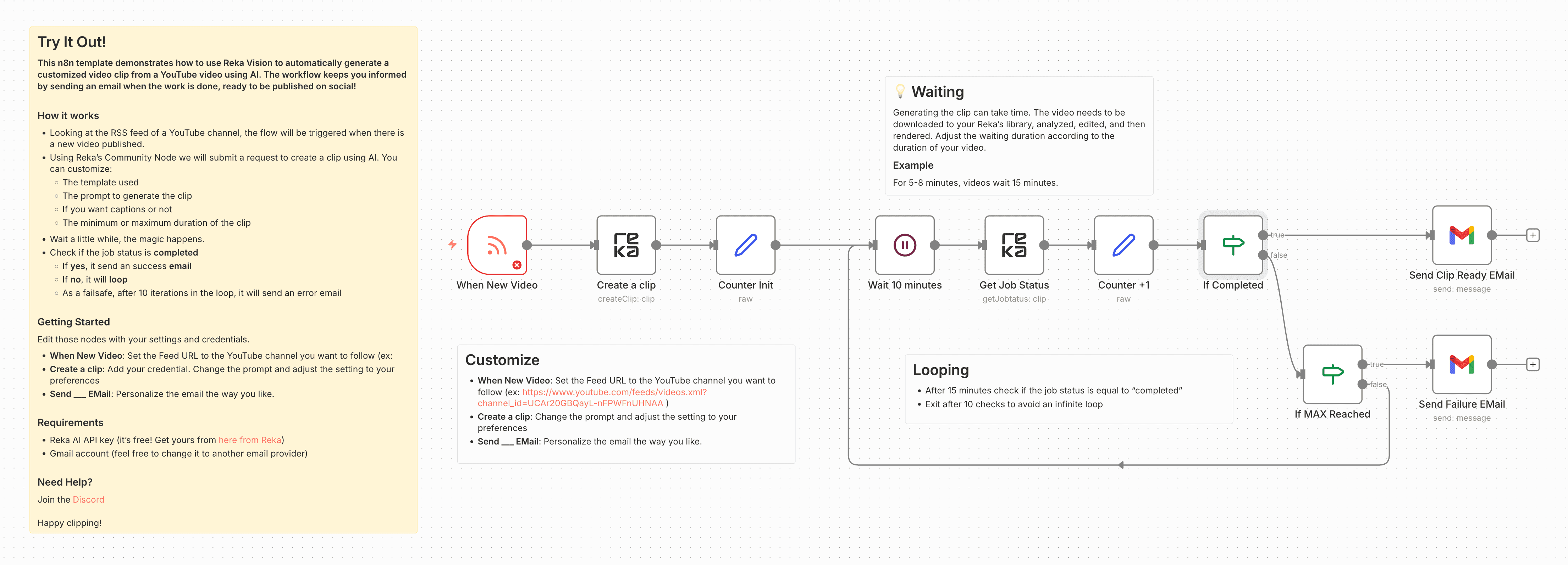 The node wraps Reka's vision API into native n8n actions, so you can add AI-powered video clipping and image analysis to any workflow.